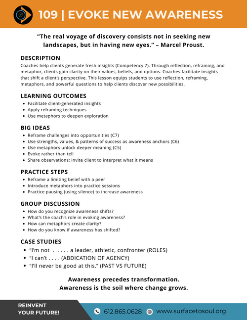 Coaches help clients generate fresh insights (Competency 7). Through reflection, reframing, and metaphor, clients gain clarity on their values, beliefs, and options. Coaches facilitate insights that shift a client’s perspective. This lesson equips students to use reflection, reframing, metaphors, and powerful questions to help clients discover new possibilities.