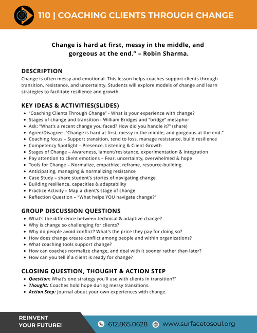 Change requires resilience. Students will explore ways to maintain presence), Listen actively, and facilitate client growth to guide clients through resistance and transition.