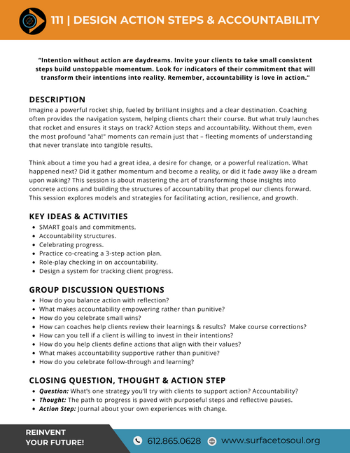 Coaching is not complete without action. This session addresses ways to help clients create realistic action plans, establish accountability, and celebrate progress as they move their intentions toward reality.