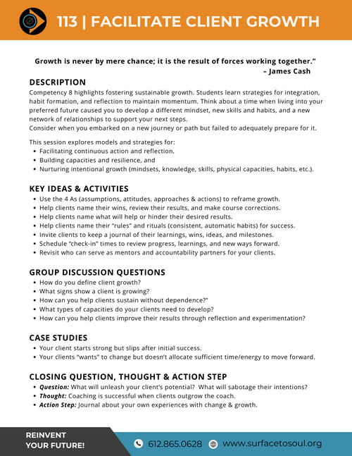 The ultimate aim of coaching is sustained client growth. This session highlights strategies that help clients integrate learning, shift mindsets, and take consistent steps toward their preferred future.