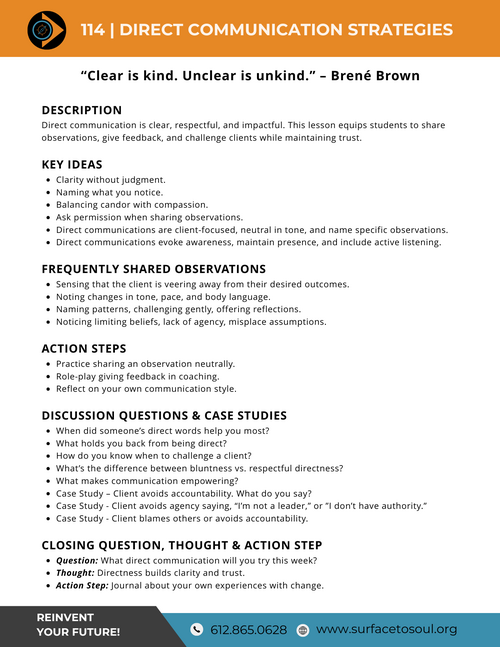 This session will help you use direct communication to evoke new awareness, address false assumptions, limiting beliefs, and challenge past and present approaches to dealing with people's challenges and opportunities in one's life.