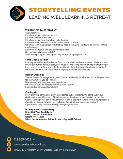 This community and annual learning event began as an initiative of the ELCA Lutheran Church and has grown into an ecumenical gathering that embraces leaders from all Christian traditions. Our learning retreats are a unique blend of practical learning and sabbath rest, with a focus on the leader as a whole person. Presentations cover everything from technological tools for ministry to leveraging conflict as an opportunity for growth. This year’s focus is on storytelling.