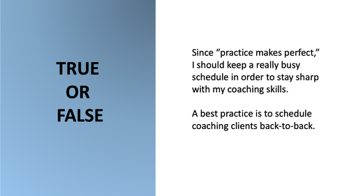 Leave at least 15 minutes between coaching sessions to clear your mind. I like to take a short walk or do some stretching exercises. I like to pray for my clients and discern which core competency I want to pay closer attention to during the session.