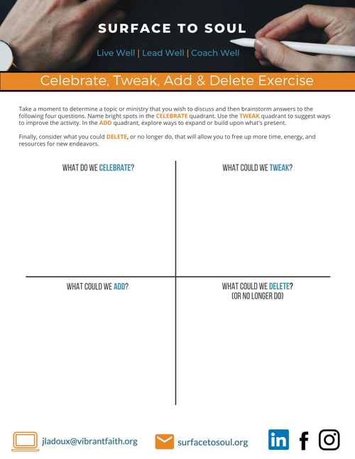 - Have leaders complete the Celebrate, Tweak, Add & Delete form to evaluate last year's annual campaign. Share notes with Campaign Coordinator.