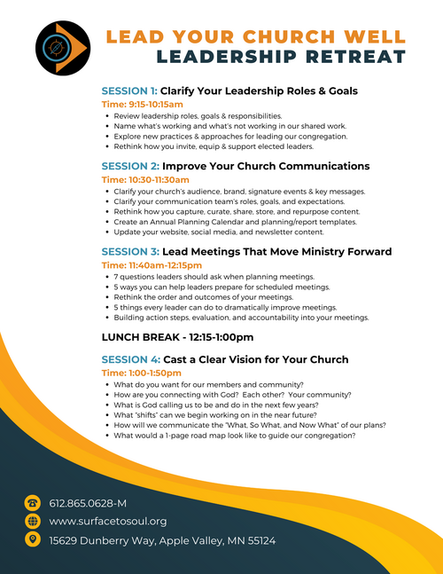 Leading well is about influence. It's about choosing to make an impact everyday, everywhere. It's also a team sport that involves making wise decisions so that you know what to say "yes" and what you say "no" or "not yet" to. This training will help you lead your church with clarity, intentionality, and creativity. Listed below you'll find key points, questions, and action steps for each of the 4 sessions.