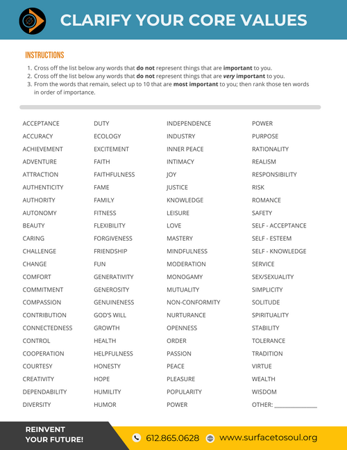 The VALUES tool is designed to help you clarify what's most important to you, and at the same time, give you permission to say NO or NOT YET to other things in your life.